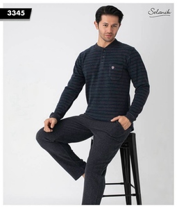 פיג'מת חורף לגברים עם חולצה מפוספסת - כחול כהה 3302