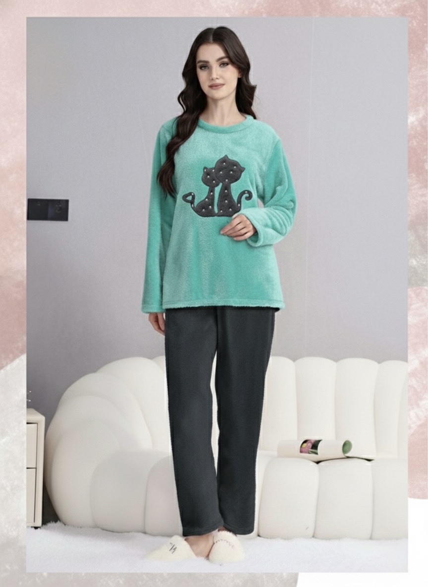 بيجاما نسائي شتوي فرو - لون فيروزي و سكني