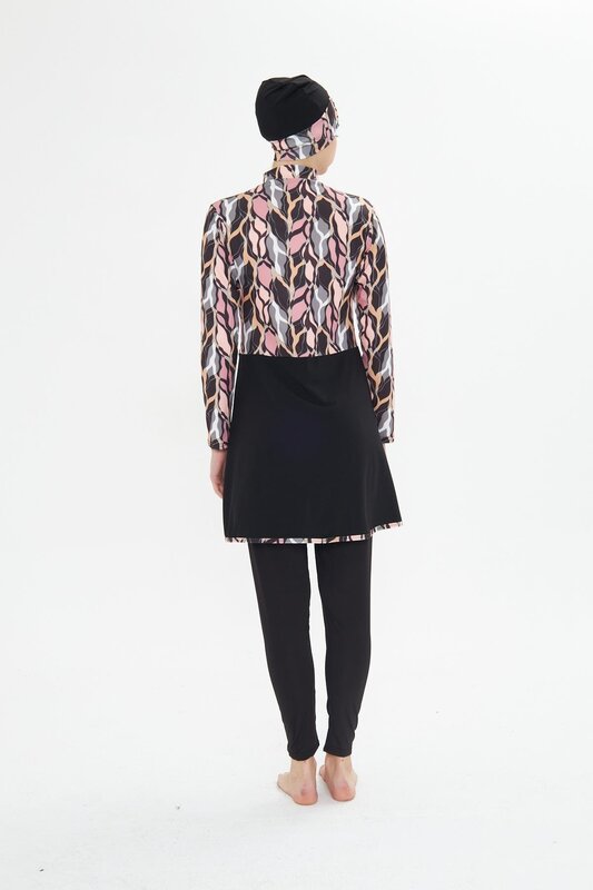 تصميم يغطي الجسم بالكامل: يتضمن تونيكًا من الليكرا بتنورة، وبنطالًا ضيقًا من الليكرا، ووشاحًا للرقبة، وقبعة سباحة.