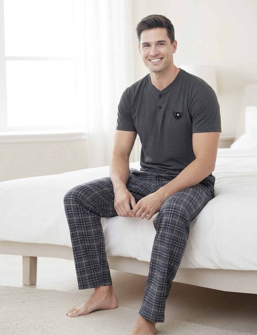 بيجاما رجالي قطن كم طويل - لون سكني 008