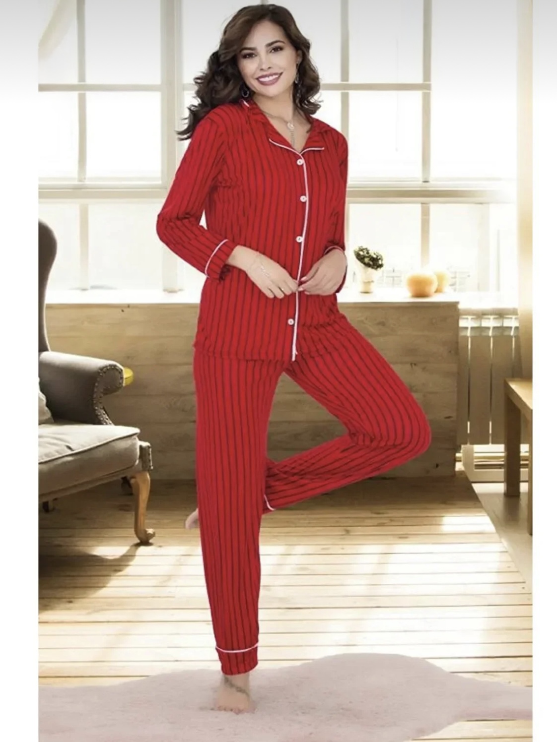 Women's cotton pajama set, button-up top, long sleeves, 041