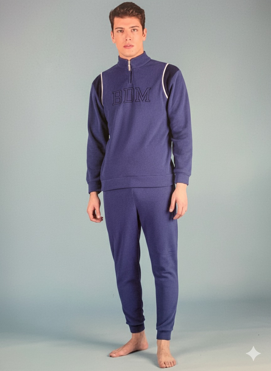 פיג'מת חורף לגברים עם רוכסן וקפוצ'ון - כחול נייבי