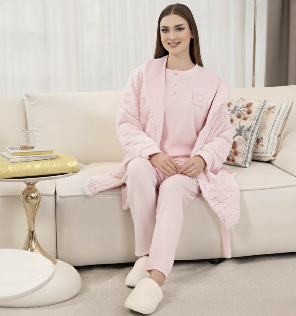 סט פיג'מות חורף לנשים עם חלוק, 3 חלקים - ורוד