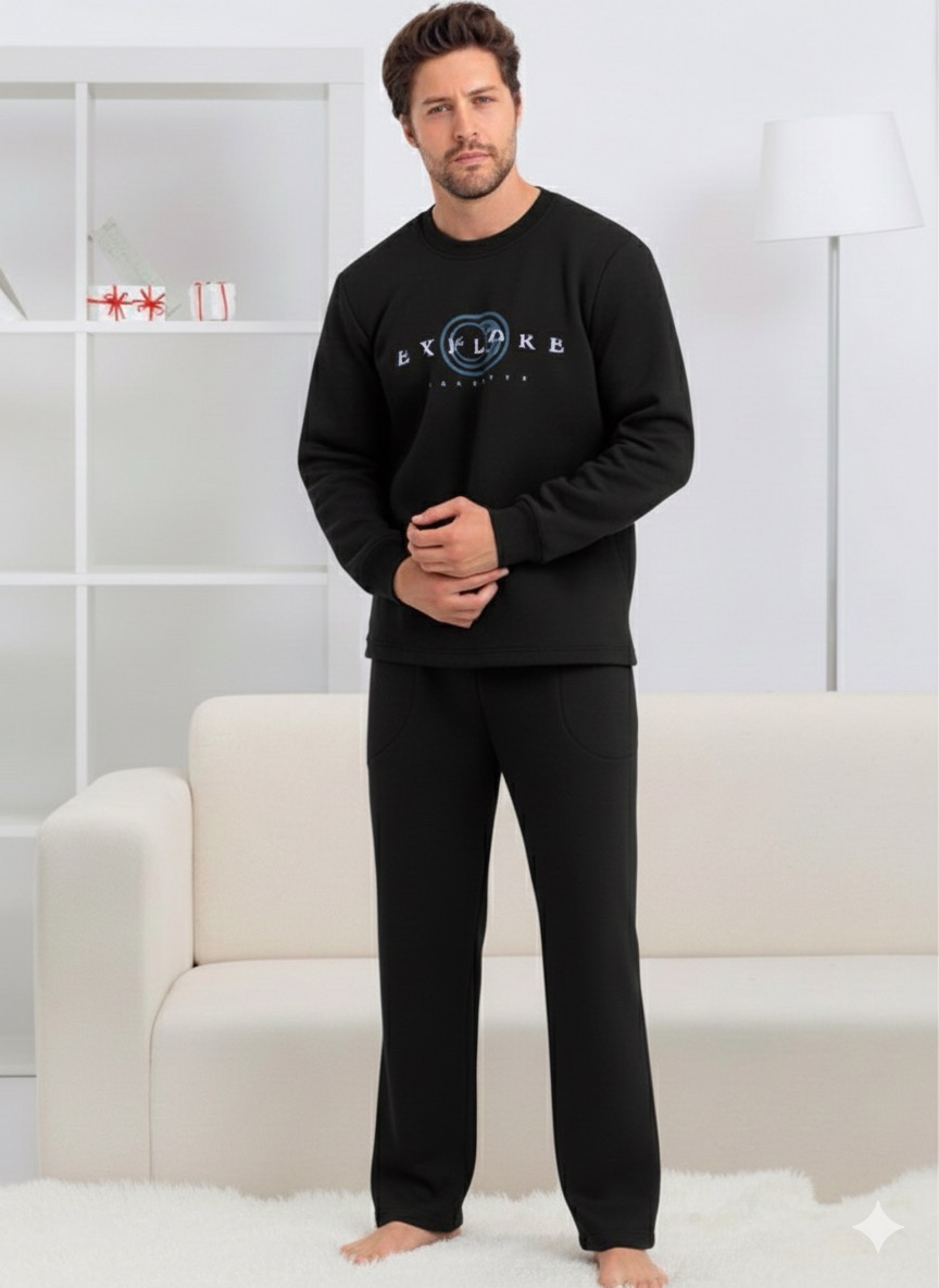 פיג'מת חורף לגברים עם רוכסן וקפוצ'ון - שחור