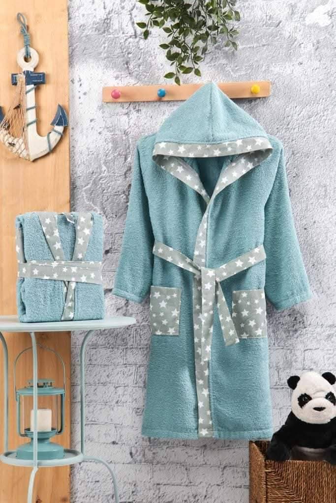 חלוק רחצה לילדים עם כוכבים וקפוצ'ון - טורקיז