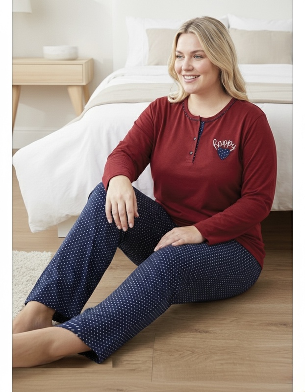 פיג'מת כותנה ארוכת שרוולים לנשים, גזרה רחבה 005