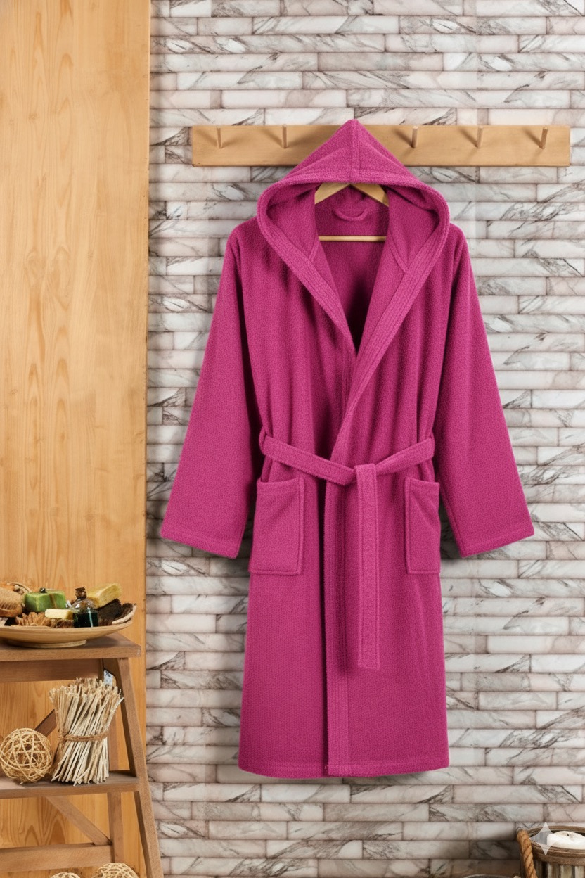 חלוק רחצה כותנה עם קפוצ'ון - צבע פוקסיה