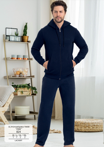 פיג'מת חורף לגברים עם רוכסן וקפוצ'ון - כחול נייבי